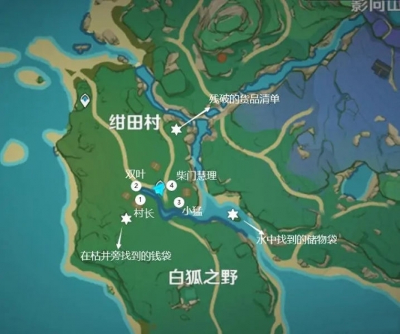 向當地人打聽,先與村長紺田傳助對話,找雙葉對話得到線索,找與小猛對話得到線索,與柴門慧理對話得到線索,對話完,根據定位查找到「在枯井旁找到的錢袋」、「水中找到的貨物袋」、「殘破的貨品清單」,獲得後回去和村長交談按順序把物品交給他,接著在他家房頂尋找村長的筆記。
