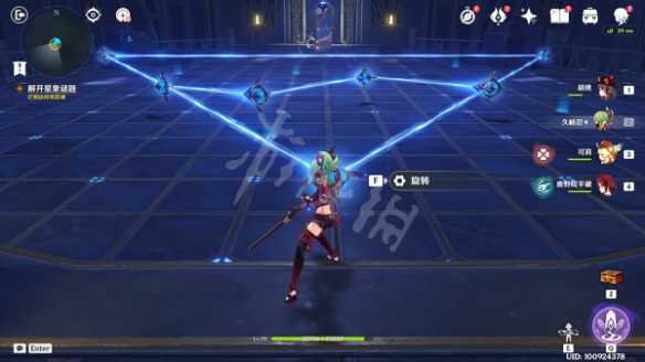 8.攻擊1 號 一次,旋轉 2號 三次,攻擊一下,3號旋轉一次,攻擊一下,4號旋轉2次,攻擊一下,5號旋轉2次,攻擊一下,6號旋轉2次,攻擊一下,7號旋轉2次,攻擊一次,出現一精緻寶箱,開啟寶箱後出現星星,跟隨星星走完幻境後觸發劇情。