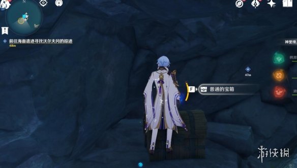 6.寶箱上方的小路 左轉又有一個挑戰,先打碎罐子下去,然後開元素視野看見假石頭,再打碎,這時回頭看見水面上方有一個寶箱,等水面上漲之後點擊寶箱即可完成挑戰。