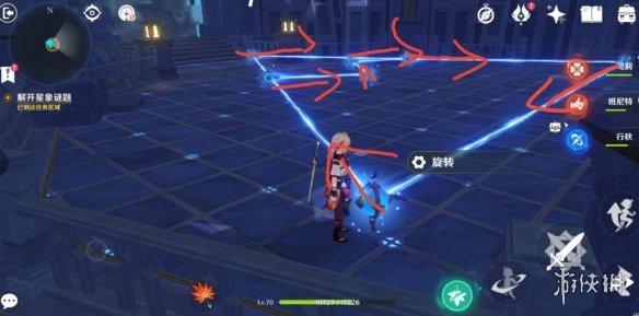 此時對應星門開啟,進入後出現連線機關,需要將機關連成頭頂上方的形狀。