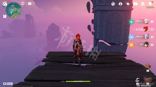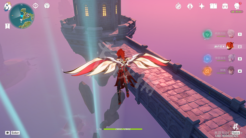 接下來我們就從這里,面朝西方向直接跳出去,打開風之翼。此時空中就會出現一串連續的風場,通過風場飛到西邊浮空的城堡通道上。