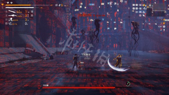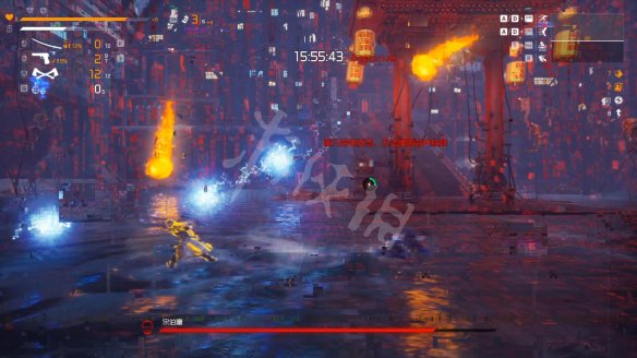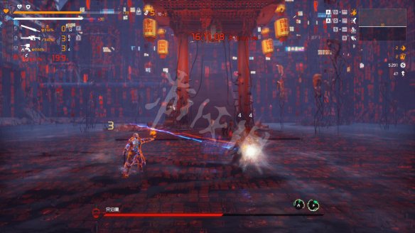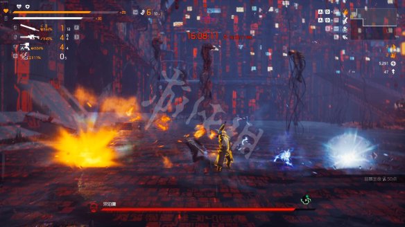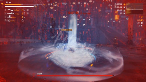 這個boss最煩的一點就是玩家用槍械擊飛他,他會給你套個致盲debuff,我初見帶的是沙漠之鷹,每開一槍都黑屏一次,雖然說問題不大,但是很影響戰斗節奏,這也是要帶耳機打BOSS的原因之一,方便致盲以後聽腳步和技能音效(這是在玩CS嗎?)