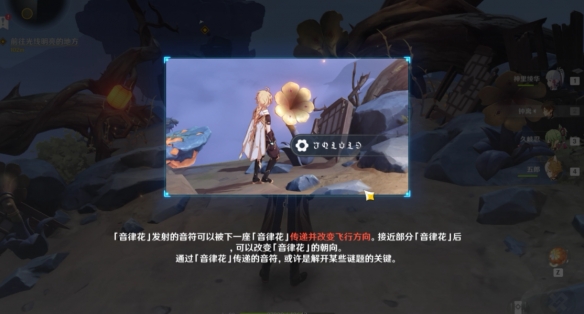 解鎖了音律樹之後直接激活,發射音浪破除符文屏障,隨後按照圖示方向調整喇叭花,然後再次激活音律樹激活大喇叭花解鎖風場乘風而起,在山頂上找到阻礙的石塊破壞掉。