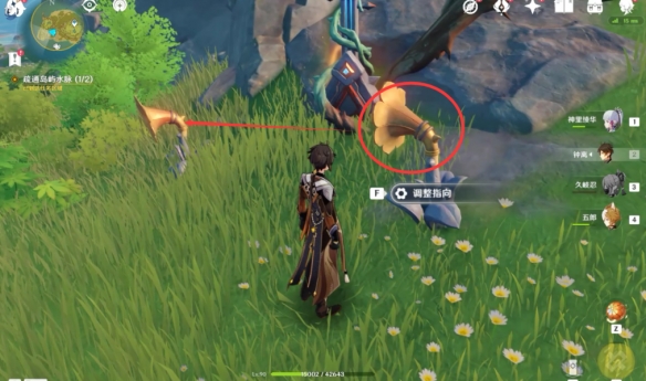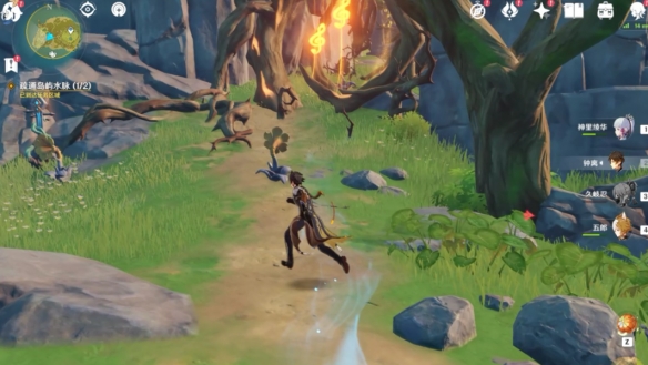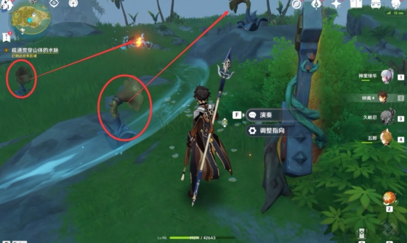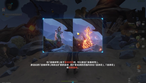 擊敗駐守的丘丘人之後獲取寶箱,再將喇叭花按照圖示方向調整,演奏音律樹發射音浪破除音符疏通水脈。