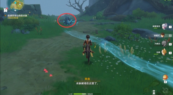離開秘境之後,我們能看到一條很明顯的水脈,跟隨水脈的指引前往尋找水泉,跟著水脈一路往前走,我們發現了第一處被堵住的地方,擊破岩石疏通水脈。