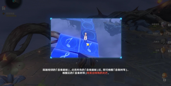 完成了左側的水脈疏通之後,我們由傳送點回去到右側的方向去,如圖所示,我們要先完成踏板挑戰來激活音奏樹(沿著踩格子就行了)。