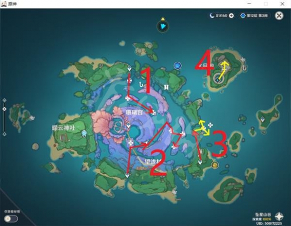 5.珊瑚宮中心的漩渦連接著淵下宮的入口,第一次走這裡,之後都用淵下宮傳送點就行了。淵下宮入口周圍有幾顆真珠,建議先標上點,再把點連線按著路線採集。