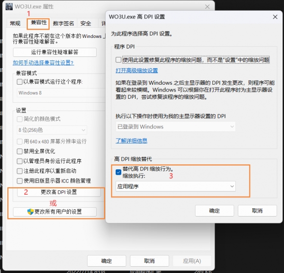 找到游戲主程序右鍵→屬性→兼容性→更改高DPI設置→高DPI縮放替代→替換高DPI縮放行為,縮放執行:應用程序。