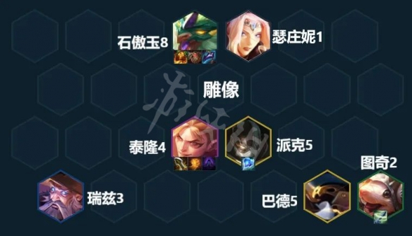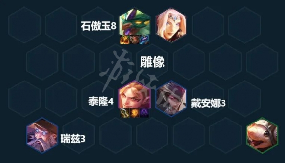 儘快上八,以瑟庄妮+瑞茲+鼠鼠3冒險為基礎找齊石傲玉+泰隆+派克/黛安娜+巴德/赫卡里姆,石傲玉和泰隆是陣容核心必須大搜找到,派克可以用任意刺客單位先代替,最佳選擇是黛安娜;巴德可以用人馬、任意秘術單位或是五費卡代替都可以。