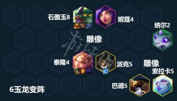 大搜出2星石傲玉+除了五費的全部二星穩定血量後就可以考慮上九。上不去九或是有高端購物也可以考慮在八級搜3星石傲玉和泰隆。可以根據來牌情況變陣6玉龍。