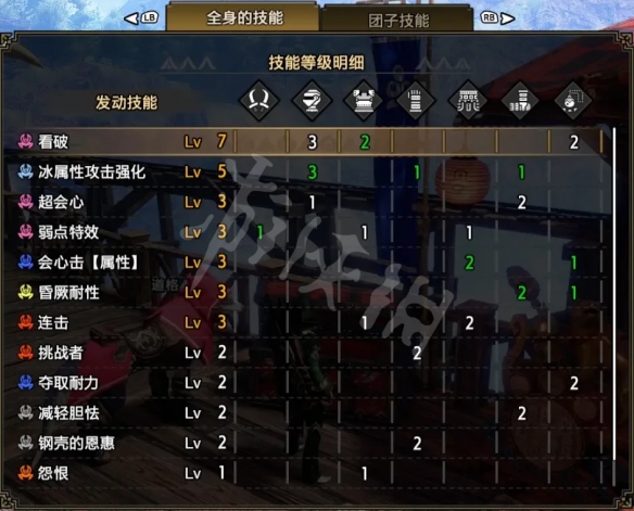 技能:看破7,冰屬性5,超會心3,弱點特效3,會心擊【屬性】3,昏厥耐性3,連擊3,挑戰者2,奪取耐力2,減輕膽怯2,鋼殼的恩惠2,怨恨1,力量解放1