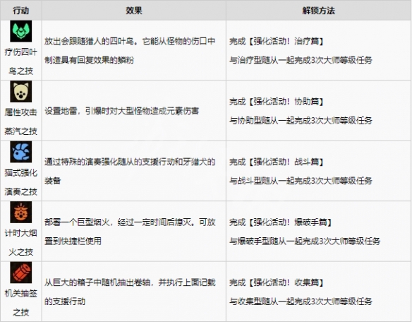 攜帶指定類型的隨從貓完成3次大師等級任務後就可以解鎖對應的秘傳支援行動。