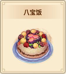 以糯米、豆沙餡為底,上面鑲有蓮子、蜜棗等八種蜜餞製成的圖案。蒸熟後澆上蜜糖汁食用,看起來色澤鮮艷,吃起來汁濃清甜。