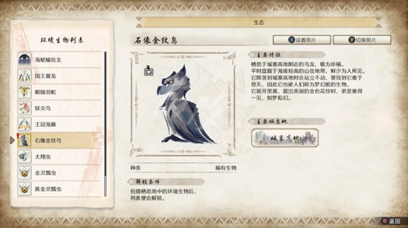 2.石像金紋鳥,位置:“城塞高地” 4區通往額外營地中間通路一處破屋上方,在岩壁中間大致位置可以參考圖片。