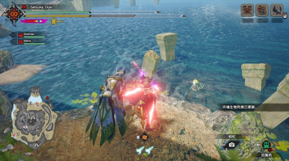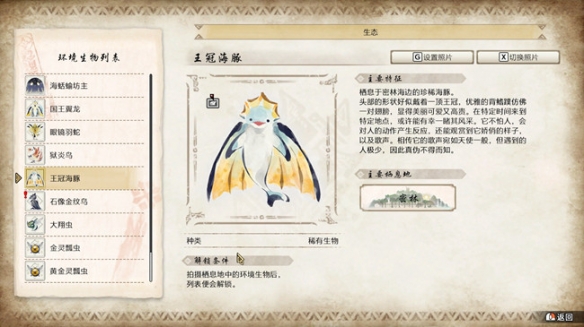 1、王冠海豚,位置:密林2區通向10區中間額外多出來的一塊區域, 上方有個洞穴,進入後會通向一處海岸,在這里有幾率碰到。
