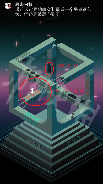 我們進入了最後一個門內後,我們又回到了*開始的地方。這時我們果斷要走下台階,走上紅色方格。然後控制下面的機關轉動90度。艾達,到達建築內側。