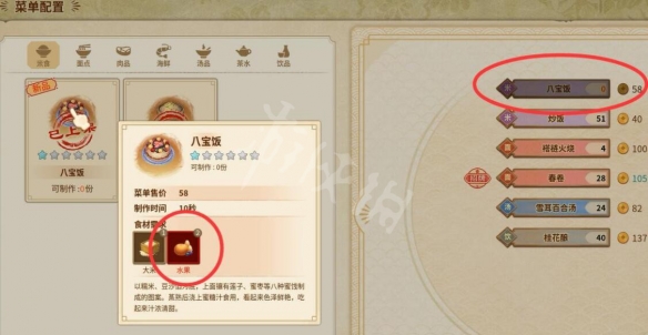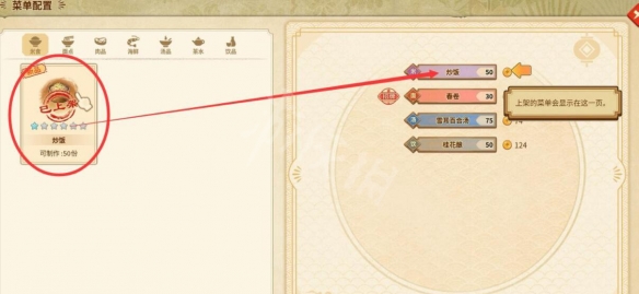 打開配置界面後,左側為已經解鎖的食譜。挑選並點擊需要上架的餐品後,餐品便會顯示在右側。