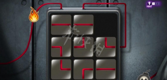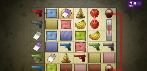 1.前往J房間,調查右側牆上門旁的面板,完成連連看游戲,按照下圖示意初始除了可以消除蘋果和冰箱之外,游戲規則不局限於框內連線,連線轉折不大於三條線的規則;