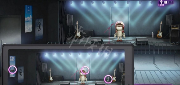 1.前往G房間,調查桌子上的平板,然後自動回到H房間,在右下屏幕調查左側藍色的海報,機器人頭上的花和右側吉他旁的塑料罐;