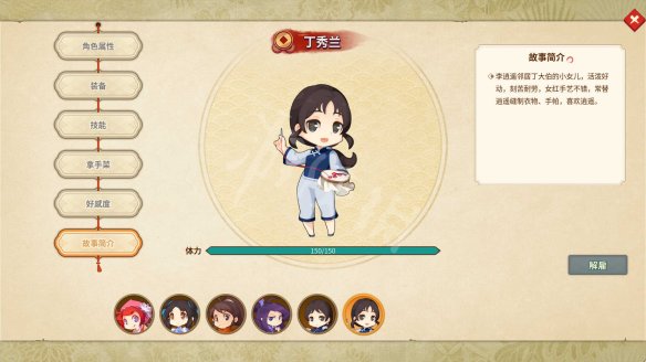 憑著可愛的外表,善良的心地,受眾人喜歡;派去餘杭鎮,跟商人聊天,能多得到一份小禮物。