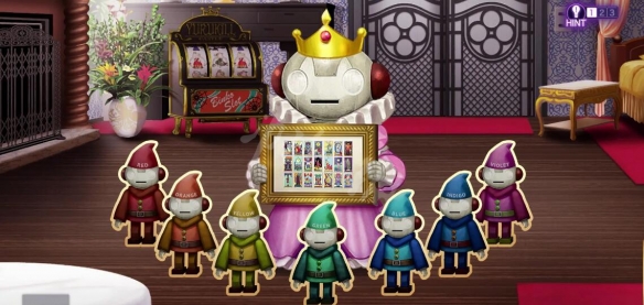 7.自動回到E房間,用來排列小矮人的提示是?選擇「彩虹圖」,調整小矮人為「紅橙黃綠藍靛紫」解謎;
