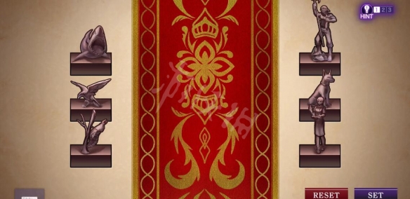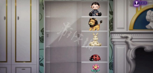 6.調查房間中間左側玻璃櫃,從上到下擺放好「人-獅-兔-蟲-花」解謎;