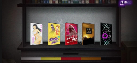6.到左側A房間,調查書架最下方一橫有顏色的地方,再調查上方的DVD,按照下方顏色擺放好DVD即可解鎖,獲得空白的繪畫日記;