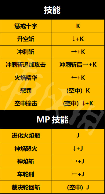 車輪刑,召喚燃燒著火焰的車輪攻擊對手,命中後能夠進行超高段數的連擊。