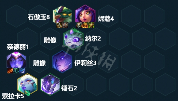 盡快上八,以4換形3玉龍為基礎找龍女/石傲玉/賽芬+索拉卡、亞索,賽芬開4幽影可以削弱敵方雙抗,且是版本最強龍神自身單卡強度高,石傲玉開6玉龍可以加成攻速和回血,這兩隻誰二星就選誰。