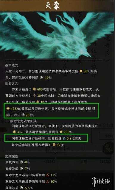 所以冥羽基本固定必選滅蒙,滅蒙主打功能性減神通cd,實測在有大法神通冷卻減25%的詞條下,神通天雷劫可以永動。另外滅蒙建議選一個回藍詞條,一直用身法藍真的不抗用(參考水劍)