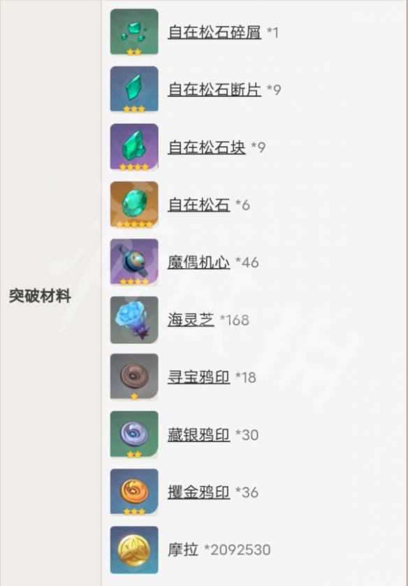 摩拉x2092530、海靈芝x168、大英雄的經驗x419、自在松石碎屑x1、自在松石斷片x9、自在松石塊x9、自在松石x6、尋寶鴉印x18、藏銀鴉印x30、撰金鴉印x36、魔偶機心x46。
