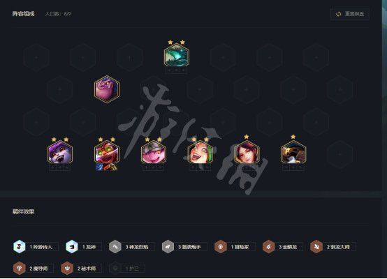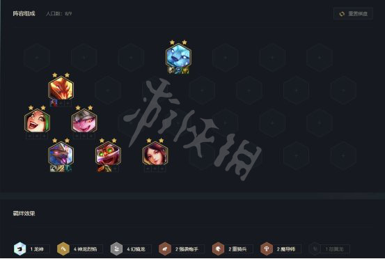 3-2拉6級需要一波D牌,做出上圖陣容,通常只要拿到2星小炮打工就足以鎖連勝了。中後期盡量不要更換陣容,確保場上有神龍烈焰羈絆,增加兩波強化出烈焰轉職的幾率。