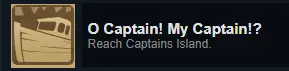 噢我的船長成就需要玩家找到沉船島並登陸來完成。沉船島比較難找,雷達上是不會標記的。想要去到沉船島的玩家可以嘗試讓船順著風的方向一直飄,碰到天黑了就睡覺,重復很多遍之後有幾率可以遇到。最好多留意觀察一下沿途遇到的島。如果是不太在乎過程只想解鎖完全成就的玩家可以和小夥伴交流找一個有沉船島和墜機島的存檔就行了,通過這種方式也是可以解鎖成就的。
