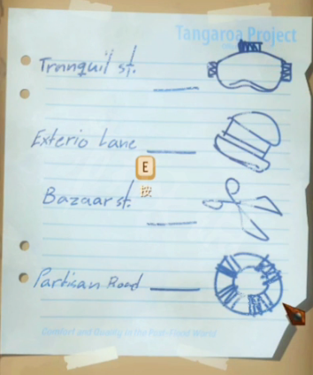 應急艙的密碼字條上可以看到四個圖標,字條中的這四個圖標分別代表唐加羅瓦號四個商店的標誌,在城市島探索過後可以在商店的地方看到數字,把四個數字組合起來就可以獲得密碼了。下面有一些打不開的房子,第一個是招牌的形狀,第二個是漢堡,第三個是理髮店,第四個是游泳圈,都是在四周比較矮小的房子。