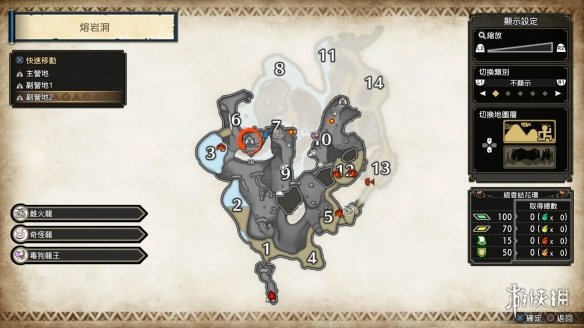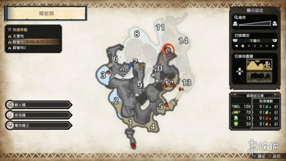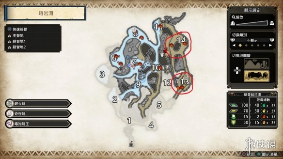 熔岩獸位置在13區和14區,但如果該區有大型怪物他們會躲起來這一點比較麻煩。