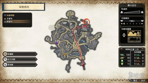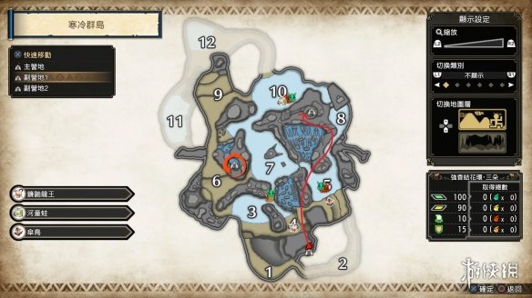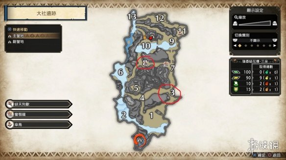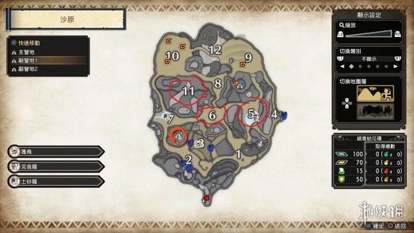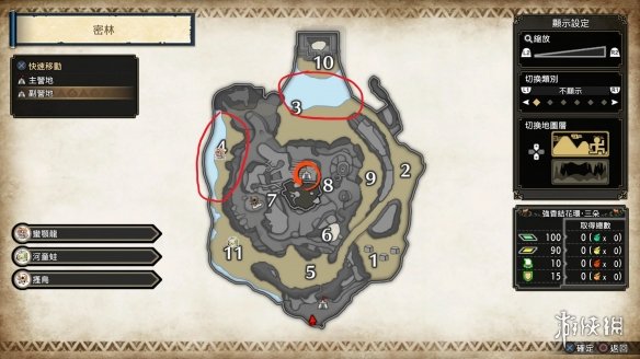 狡狗龍位置如我圖圈起來的範圍,這些地方都蠻多狡狗龍的,可以一次清光,狩獵完成後回去找雜貨店NPC回報任務就可以開啟這個副營地。