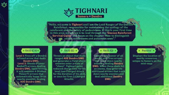 根據爆料3.0版本會推出提納里、柯萊、多莉三個新角色。其中提納里為五星草屬性弓箭角色,蓄力攻擊造成草屬性傷害,命中敵人後,還會分散出4支追蹤箭,自動瞄準周圍敵人造成範圍草屬性傷害。E技能會拋出一個物體,造成草屬性範圍傷害,並製造一個使敵人進入混亂狀態的領域,該技能持續期間,提納里蓄力箭的蓄力時間減少。Q技能能夠收集所有種子並發射箭矢追蹤附近的敵人,造成草屬性傷害,命中敵人後還會額外產生箭矢追蹤附近的敵人並造成額外草屬性傷害。