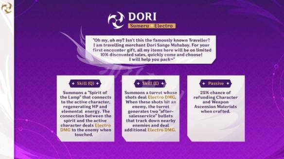 多莉為四星雷屬性大劍角色,E技能能夠召喚炮台,命中敵人後還會產生兩個追蹤彈,追蹤附近敵人造成雷元素傷害,Q技能召喚一個燈靈靈鏈接前台角色,持續回血回能,鏈子對觸碰的敵人造成雷元素傷害。