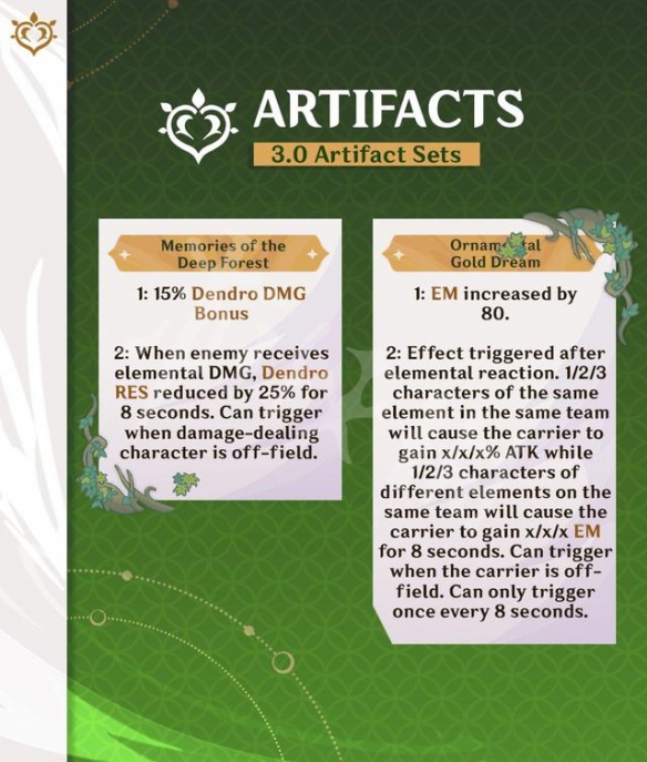 早在之前就有玩家爆料過3.0版本會推出兩套新聖遺物,不過被證實為假。如今又有玩家爆料了兩套新聖遺物,真實性更高一些。第一套聖遺物兩件套是增加15%的草屬性傷害,四件套時敵人受到元素傷害,草元素抗性降低25%,持續8秒,造成傷害的角色在後台也可觸發。