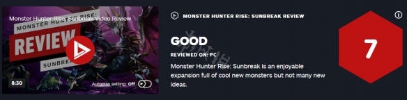 IGN給怪物獵人崛起曙光打出了7分的好評,表示怪物獵人崛起曙光是一款有趣的擴展包,裡面有很多很酷的新怪物,但並沒有太多新想法。