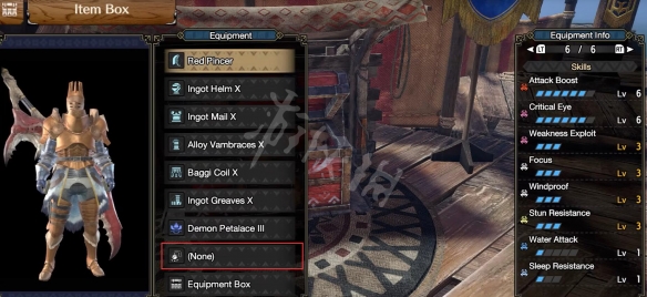 技能/裝備攻擊6,看破6,弱特3,集中3,風壓耐性3,昏厥耐性3,水屬性攻擊1,睡眠抗性1,匠2,風壓耐性2,水屬性攻擊強化1,體力恢復量提升1,迴避性能1,零件改造1。