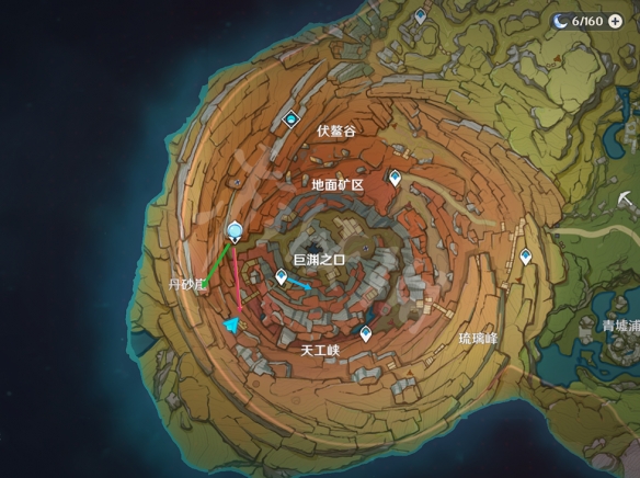 需要領取‘’千年千岩‘’任務(在巨淵之口下方的位置找到礦工阿旺對話領取任務)上圖藍色路線