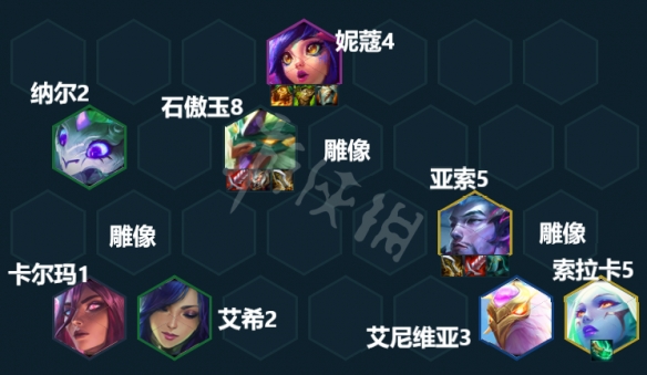 盡快上八,大搜找2星妮蔻和2星石傲玉在八級就能開出9玉龍的羈絆。索拉卡來了替換掉塔里克,亞索一般是在上九之後再考慮掛,可以開出3神龍尊者羈絆補充陣容輸出。站位在打霞的時候記得不要讓妮蔻、石傲玉和亞索同時被倒鉤拉,這套陣容在打霞時非常吃站位,石傲玉和亞索一定不能被秒!