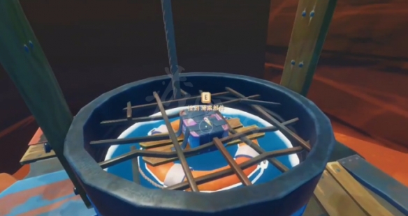 第一個滑索部件在水井裡,需要玩家往裡灌水最後利用浮力拿出這個滑索部件。在水井的上方可以看到幾截水管,調整好他們的方向再使用閥門壓水就可以把水送進水井裡了。