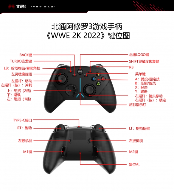 WWE 2K22新作進行了重新設計的引擎,全新操作等新內容,同時也支持手柄操作,有些玩家對鍵位不是很不熟悉,這裡給大家帶來了WWE 2K22北通阿修羅3手柄操作按鍵一覽,快來看下吧。