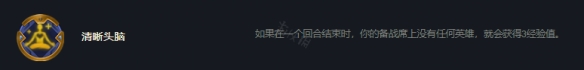 清晰頭腦是很多老玩家比較熟悉的強化符文了,非常適合運營陣容去選擇幫助前中期更好地過渡。達成清晰頭腦目標的條件和紛亂頭腦相反,清晰頭腦一回合只給3經驗值,但是和紛亂頭腦相對比,清晰頭腦不存在紛亂頭腦那樣需要先犧牲一定數量的經濟來填滿備戰席這個過程,更多情況下都是來什麼玩什麼,由於要保持備戰席空餘所以不太適合賭狗陣容去選擇。