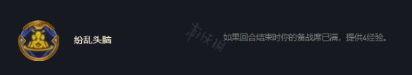 紛亂頭腦能夠在你備戰席滿的情況下為你提供4經驗。可以將這4經驗換為金幣來換算,除去填滿備戰席的成本,等於一回合能夠穩定獲取4金幣。它的唯一犧牲就是填滿備戰席可能會吃不到利息,但是如果回合數多起來之後完全可以彌補這個不足。總體來說是非常推薦選擇的一個過渡類強化符文。