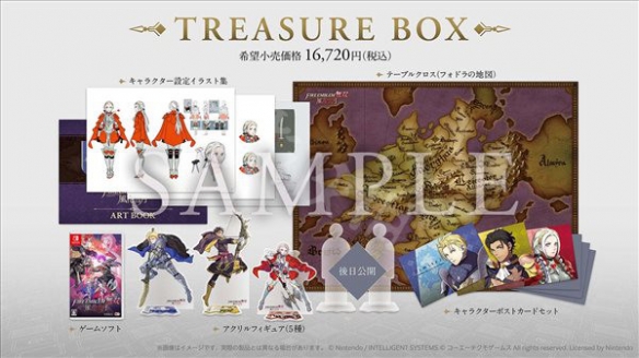 火焰紋章無雙風花雪月TREASURE BOX包含遊戲本體,角色設定插畫集(橫向A4,共128頁),餐桌布(芙朵拉地圖,W820 x H606mm),亞克力模型(5種,約H100-130mm),角色明信片組合(W148 x H100mm)。