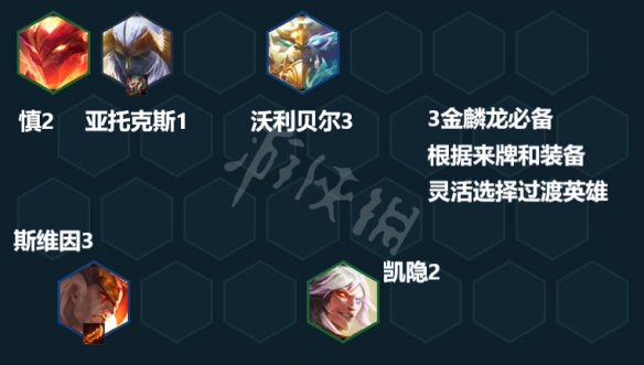 3-5拉七,大搜至少找出一張金麟龍+2星斯維因/1星霞/庫奇,金鱗龍沒來可以拼除了索爾和敖興之外的任意龍神帶羊刀和其他裝備過渡,再沒有也可以掛2迅捷射手或是2炮手等羈絆。