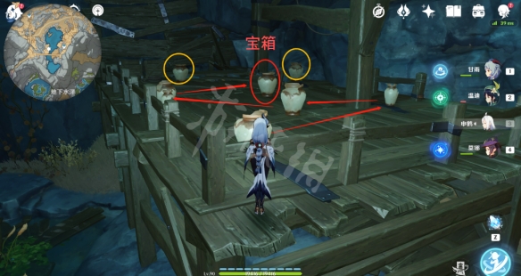 紅色圈的瓦罐為寶箱罐子,紅色箭頭為需要擊碎的瓦罐(除寶箱罐,其它與擊碎順序無關),黃色圈的瓦罐不要擊碎。